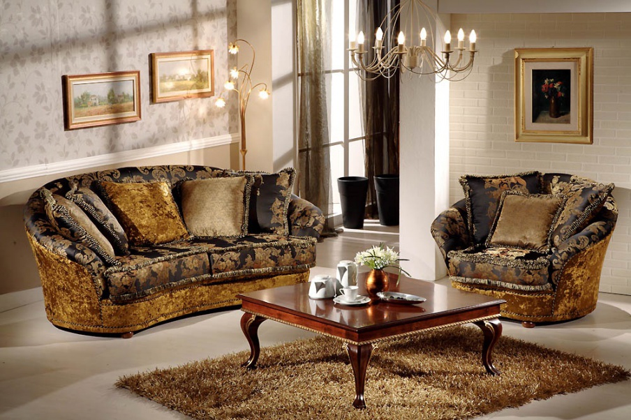 Sofa set from the Italian manufacturer Guerra Vanni. Set includes two seater sofa, armchair. The furniture is made of solid wood in fabric from the range campaign. The seats are removable. The design of complementary decorative pillows of different sizes. Colours in stock.