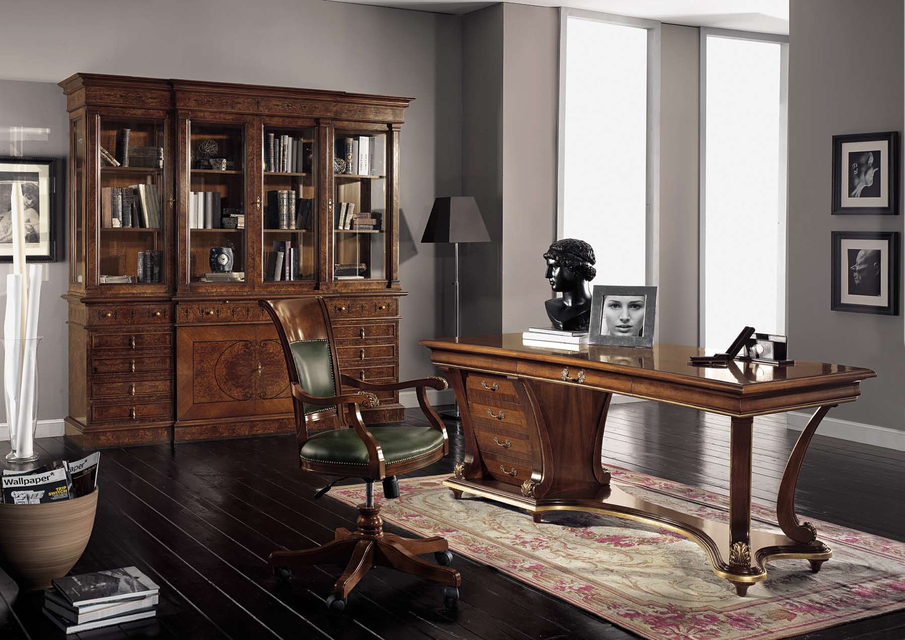 Headsets for the office from the Italian manufacturer Guerra Vanni. Set includes Desk, Desk chair. The furniture is made of natural wood. Decorative accessories - metal. Table with drawers. Rotary chair, on wheels, with cover. Colours in stock.