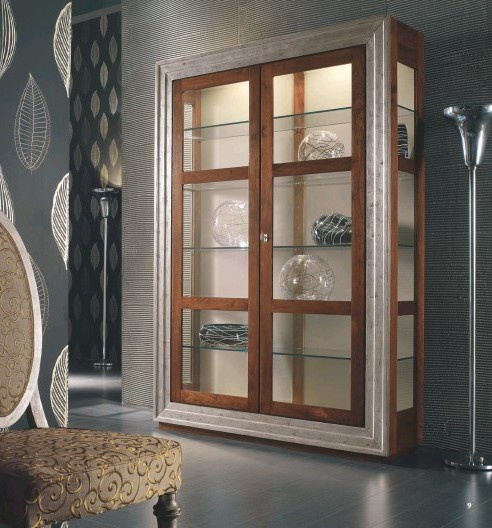 Showcase dvuhdollarovymi manufacturer Cantiero. Showcase made of wood, doors of tempered glass. The sidewalls of this model transparent, glass shelves. Within the model there lights.