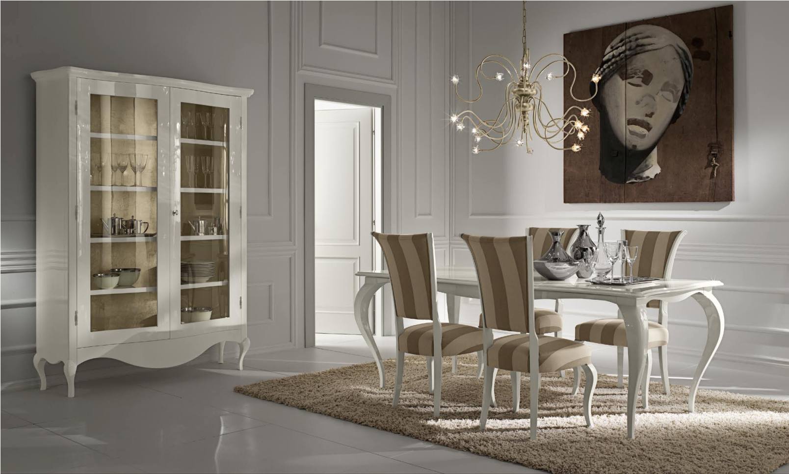Raffaello dining set piano sagomato from the Italian manufacturer Cantori. This headset presents the model of a dining table, chairs and sideboard. Color in light tones.