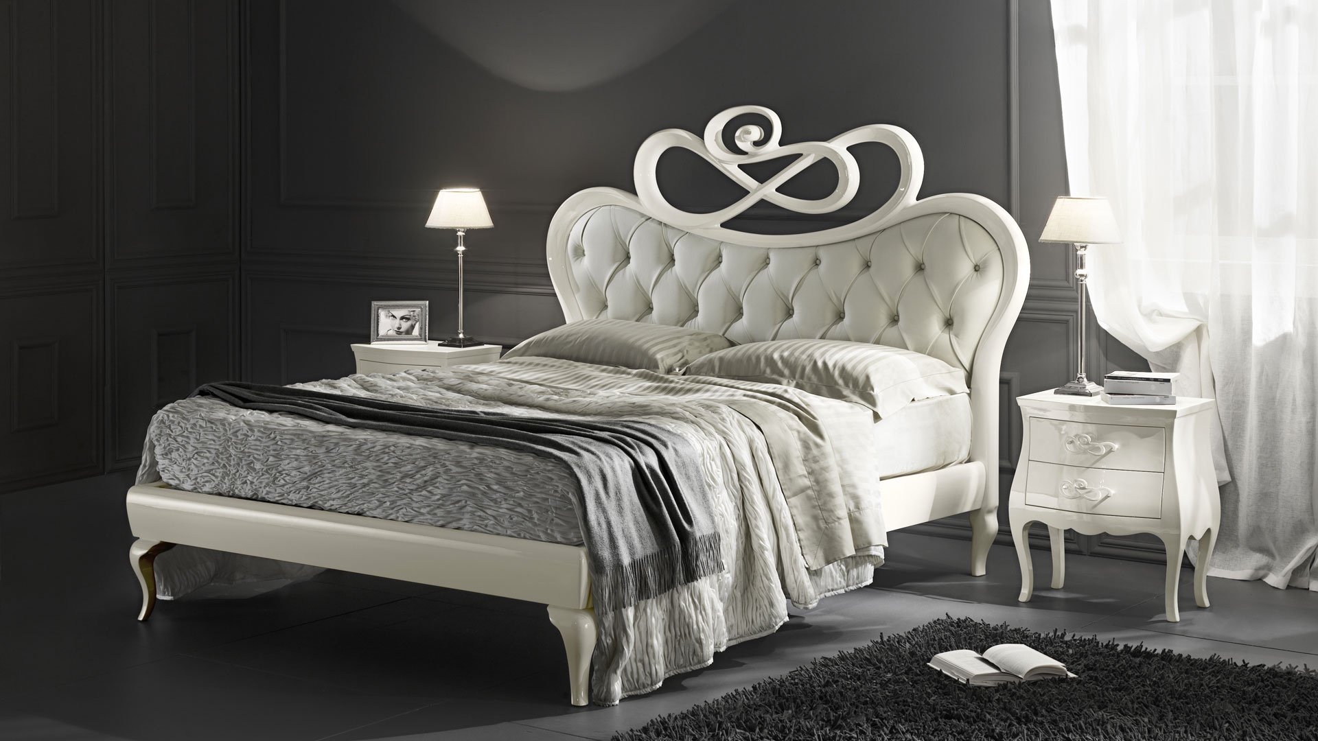 Bedroom set Italian Mozart manufacturer Cantori. This headset presents the model bed and bedside tables. Double bed with high upholstered headboard. Headboard with a shaped element made of wood. Colours in stock.