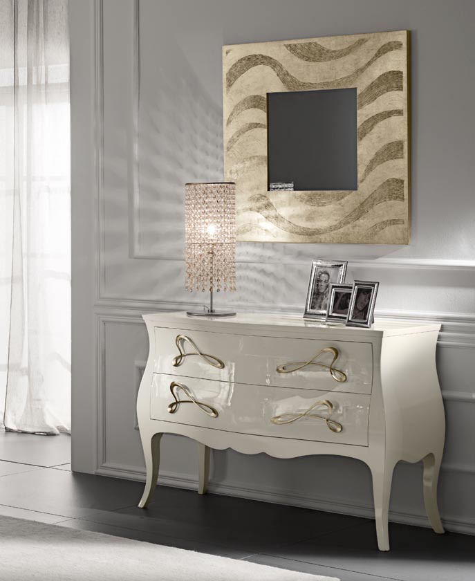 Chest Leonardo Italian manufacturer Cantori. Dresser with sliding drawers with Golden curly handles. Color scheme in white tone. Decorative alimentum are the rounded curves of the drawers and handles of drawers.