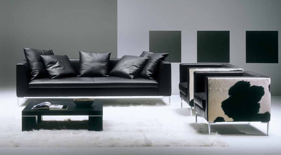 Sofa set from the Italian manufacturer Gyform. Set includes sofa and two chairs. The frame is made of powder painted steel. Padding - skins and genuine leather any color and texture from the product range of the company. Filler - polyurethane foam. The design is complemented with decorative pillows. Colours in stock.