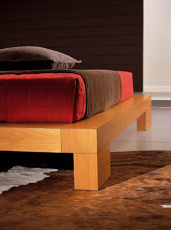 Double bed from Italian manufacturer Favero. The frame and legs are made from solid wood. Finish offered with veneer or glossy varnish. The headboard is covered with leather. Colors offered in blue or red. The bed are connected with bedside tables. The model is made in a modern style.