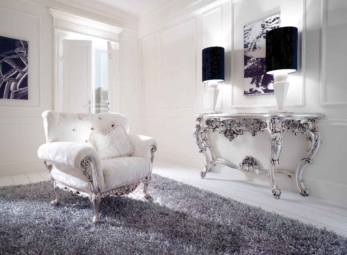 A chair from the Italian manufacturer Gregori. The frame is made from solid wood in a silver plated finish, upholstered in textiles from the range of the campaign. Model relax is designed for the living room in Baroque style. The design complements decorative pillow. Product color white.