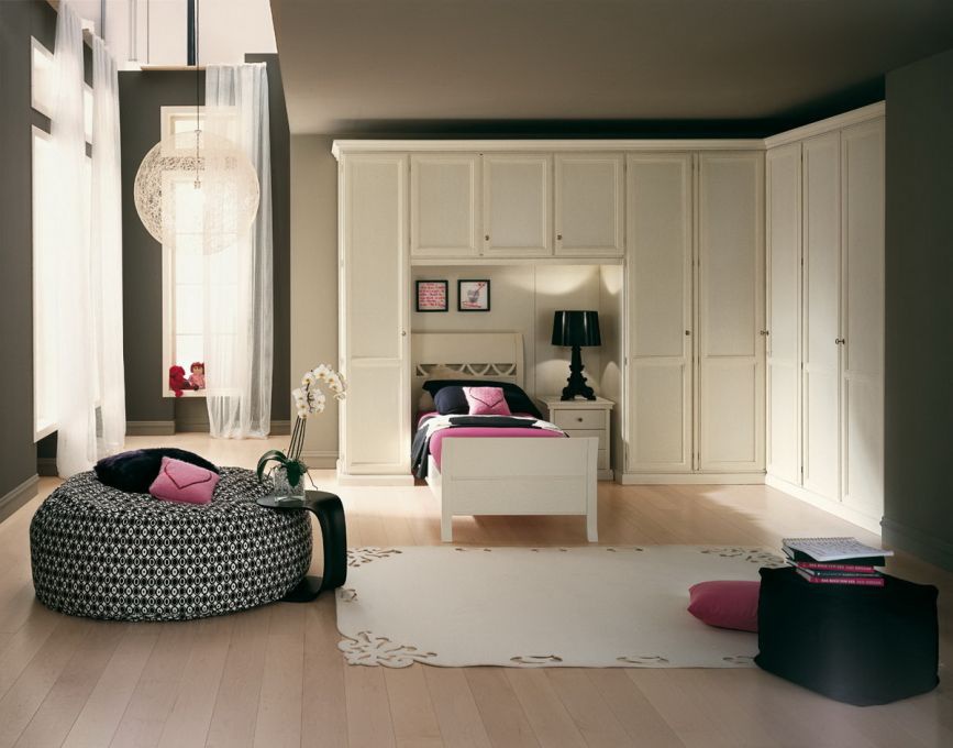 Set for kids room from Italian manufacturer Favero. The model is made in classic style. Includes single bed, wardrobe, bedside tables and pouf. Material - solid wood. Finishes available in combinations of white and soft pink colors. Accessories made of metal. Upholstery textile from the company portfolio.