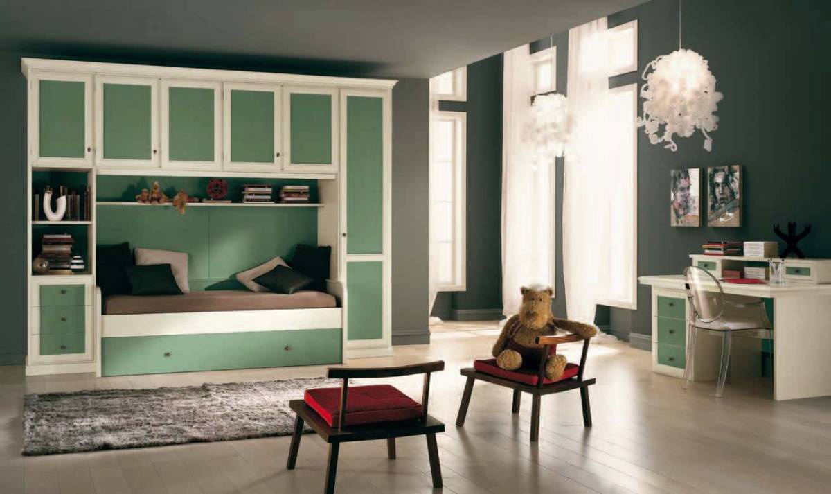 Set for children by Italian manufacturer Favero. Set includes wardrobe with built-in bed, Desk and chair. The furniture is made of solid wood. The bed is complemented with a drawer for linen storage. Headset in green color tone.