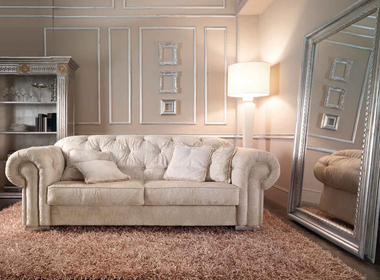 Sofa from Italian manufacturer Gregori. The frame is made from solid wood, the seat filler - foam, upholstery - textiles from a range of campaigns. The seats are removable. Double the model for the living room in Baroque style. The design of complementary decorative pillows. Product color ivory.