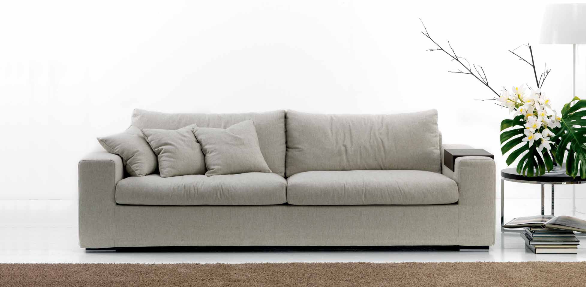 Two-seater sofa from Italian manufacturer Giulio Marelli. The frame is made from solid wood, filler - foam, upholstery - textiles from a range of campaigns. Seat and back are removable. Model with built-in table in the armrest. A good choice for living room in modern style. The design of complementary decorative pillows. Colours in stock.