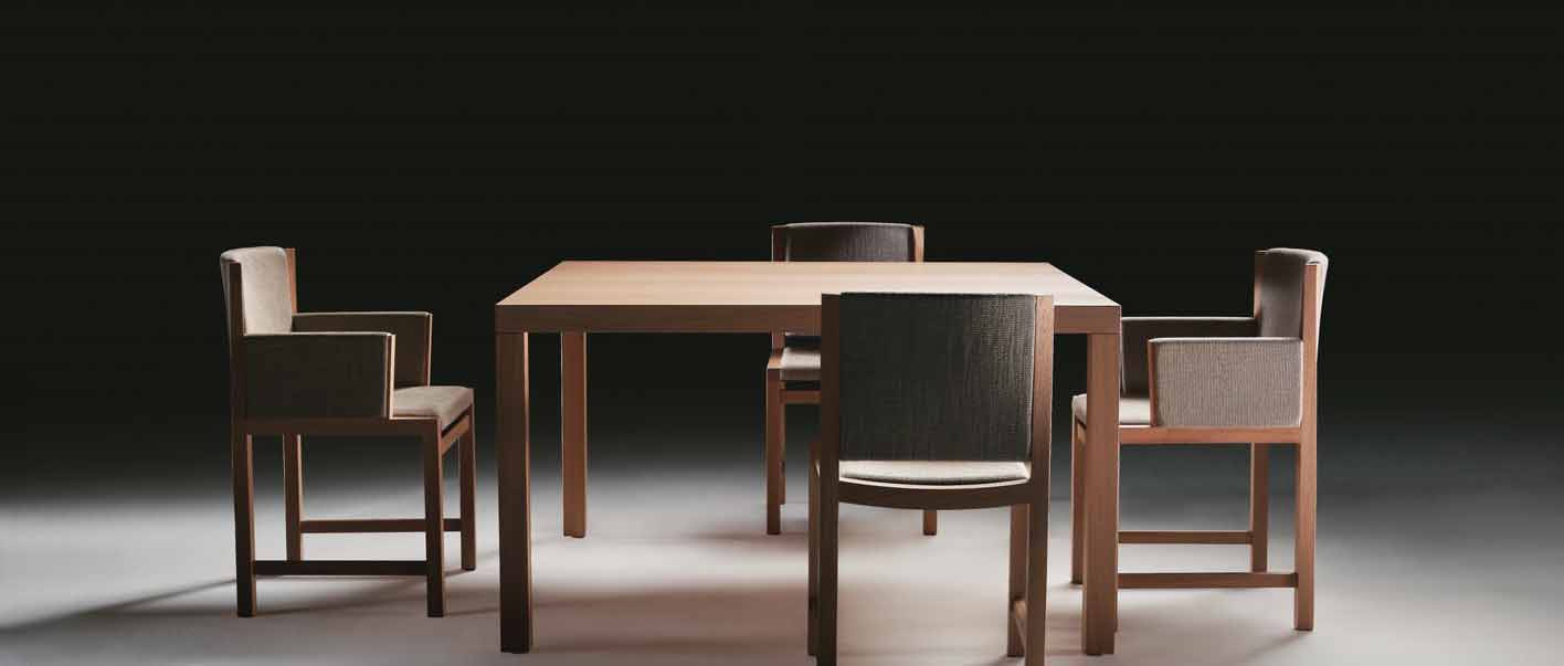 Set for the dining room from Italian manufacturer Giulio Marelli. Set includes rectangular table and chair. The furniture is made of solid wood. Chair with upholstery and armrests. Colours in stock.