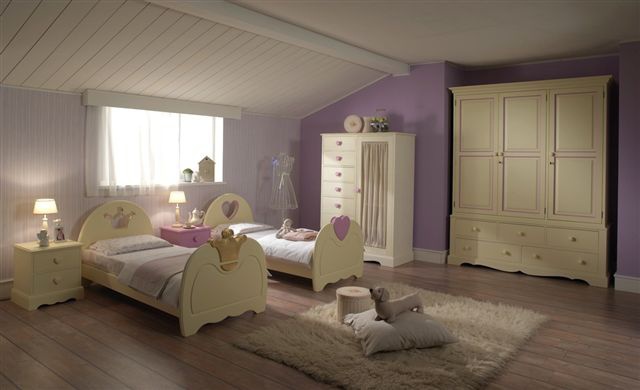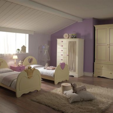 Set for kids room from Italian manufacturer De Baggis. Designed for two children. Includes single bed, wardrobe, chest of drawers and bedside tables. Frames made from solid wood. The finish is offered in white. Decorative accessories painted in lilac color. Set made in a classic style.