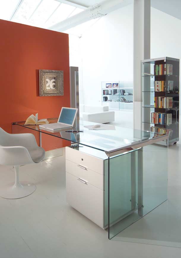 Desk from the Italian manufacturer Gallotti & Radice. The model is made in modern style. Attracts attention with its original design. Remarkable for harmony and ease. The frame and legs are made of chromed metal. Worktop and side panels made of transparent glass. In addition, it is proposed bedside table with drawers.
