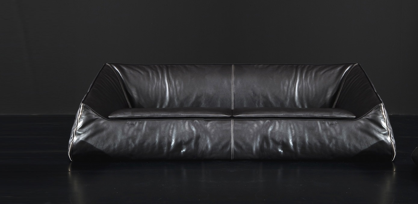 A double sofa from Italian manufacturer Gamma Arredamenti. Model with rounded lines. Filler - foam of varying stiffness. The upholstery is made of black leather. They are decorated with decorative inserts. Made sofa in contemporary style.