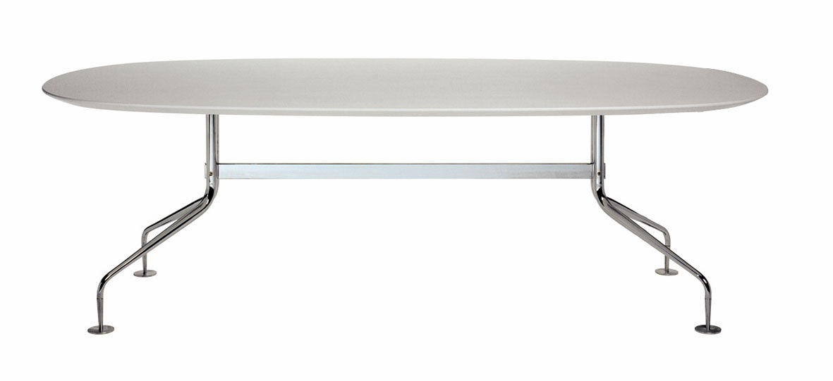 Dining table from Italian manufacturer Accademia. The frame is made of metal. Legs are completed with a round metal inserts. The oval model is made in a modern style.