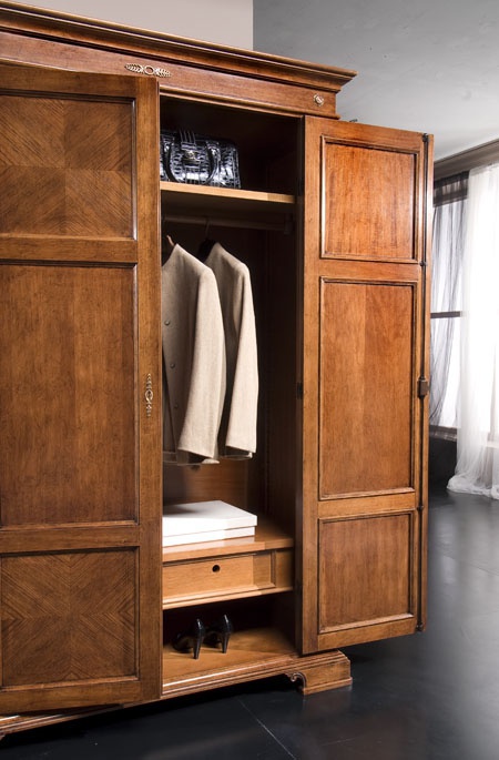 Wardrobe from the Italian manufacturer Arcari. Wardrobe in a classic style. The facade is decorated with intarsia of wood veneer of different colors.