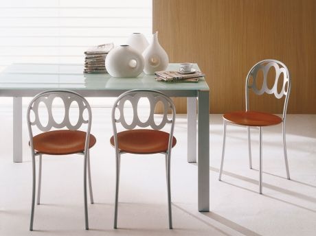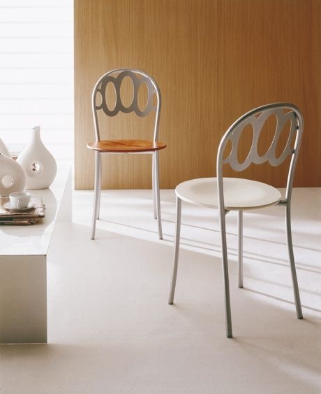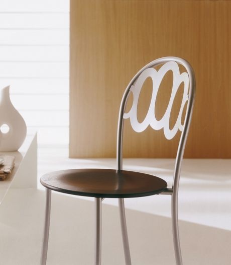 The Gio chair by Italian manufacturer Bontempi Casa. Reliable metal frame with a seat made of wood. The model with the original backrest is available in a contemporary style. A large number of colors.