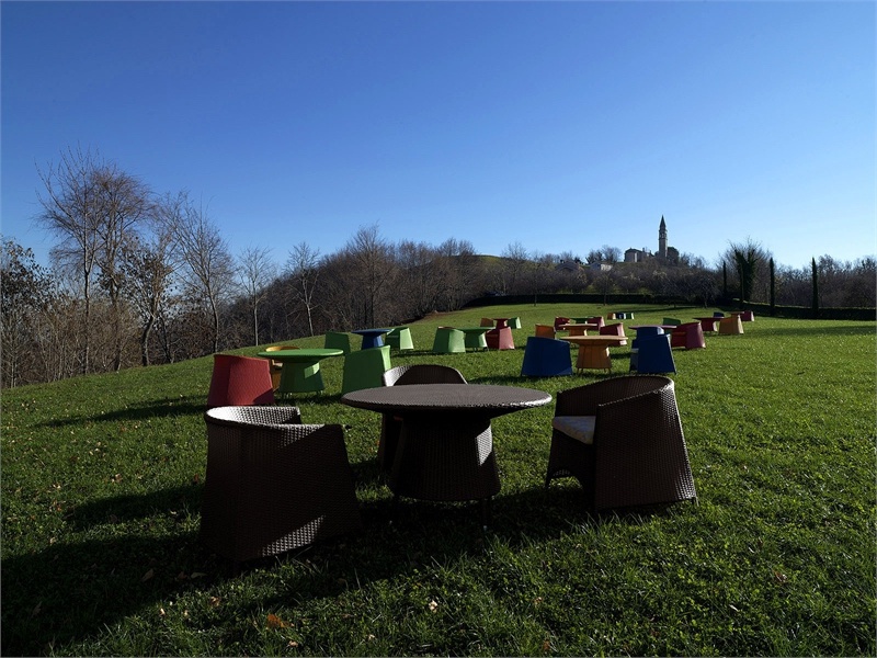 Italian dining room set for the production of Varaschin. Set includes: dining table and chairs. The frames are made of wood. The netting is made of synthetic fibers. The model is perfect for use outside and indoors.