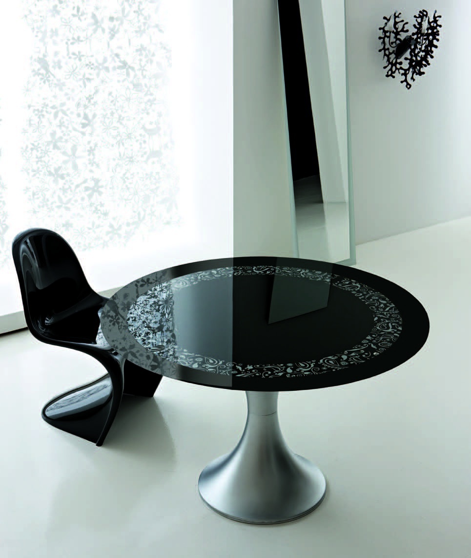 Dining table from the Italian manufacturer Glass&Glass. The base is made of metal, top is glass with pattern. Model round shape for dining room in modern style. Product color black.