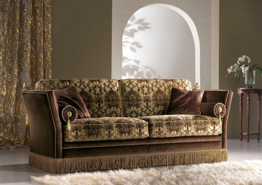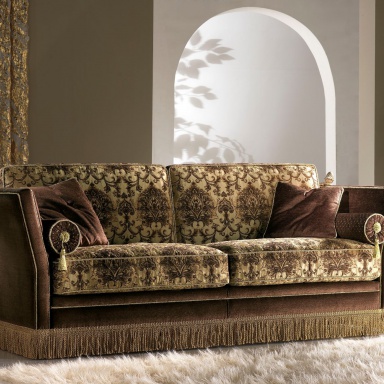 Agave sofa from Italian manufacturer Fasal Castelli. The frame is made from solid wood, upholstery - textiles from a range of campaigns. The base is hidden a decorative "skirt". Seat and back are removable. The design of complementary decorative pillows and cushions. The model is designed for the living room in a classic style. Product color brown.