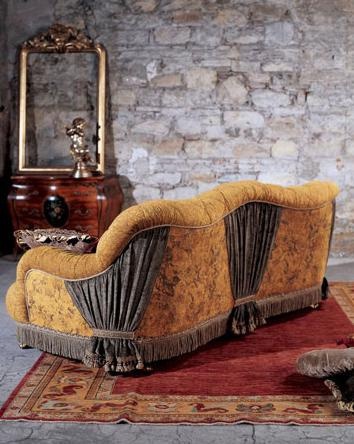 Italian sofa set Alexander Mantellassi production. Two seater sofa and pouf. Inner frame is made of wood. Upholstery - textiles from the company portfolio. Filler foam. Colours in stock.