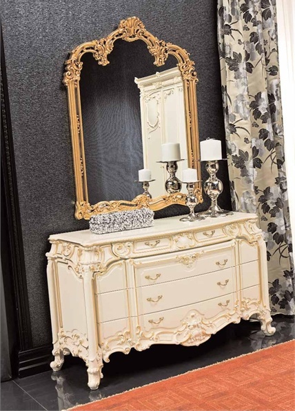 Headsets for bedrooms from Italian manufacturer Silik. Includes double bed, chest of drawers and bedside tables. Frames made from solid wood. Upholstery textile from the company portfolio. Fittings made of metal. All models are adorned with decorative hand carved and gilt.