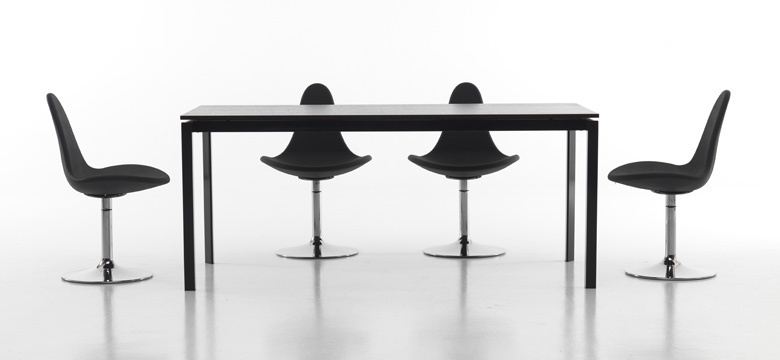 Set for the dining room from Italian manufacturer Sintesi. Includes dining table and chairs. The frame is made of metal. The tabletop is offered two options of glass or solid wood. Finish to be selected from the range of the company. Chairs with a round base and a comfortable seat. Finish available in black. Headsets are made in a modern style.
