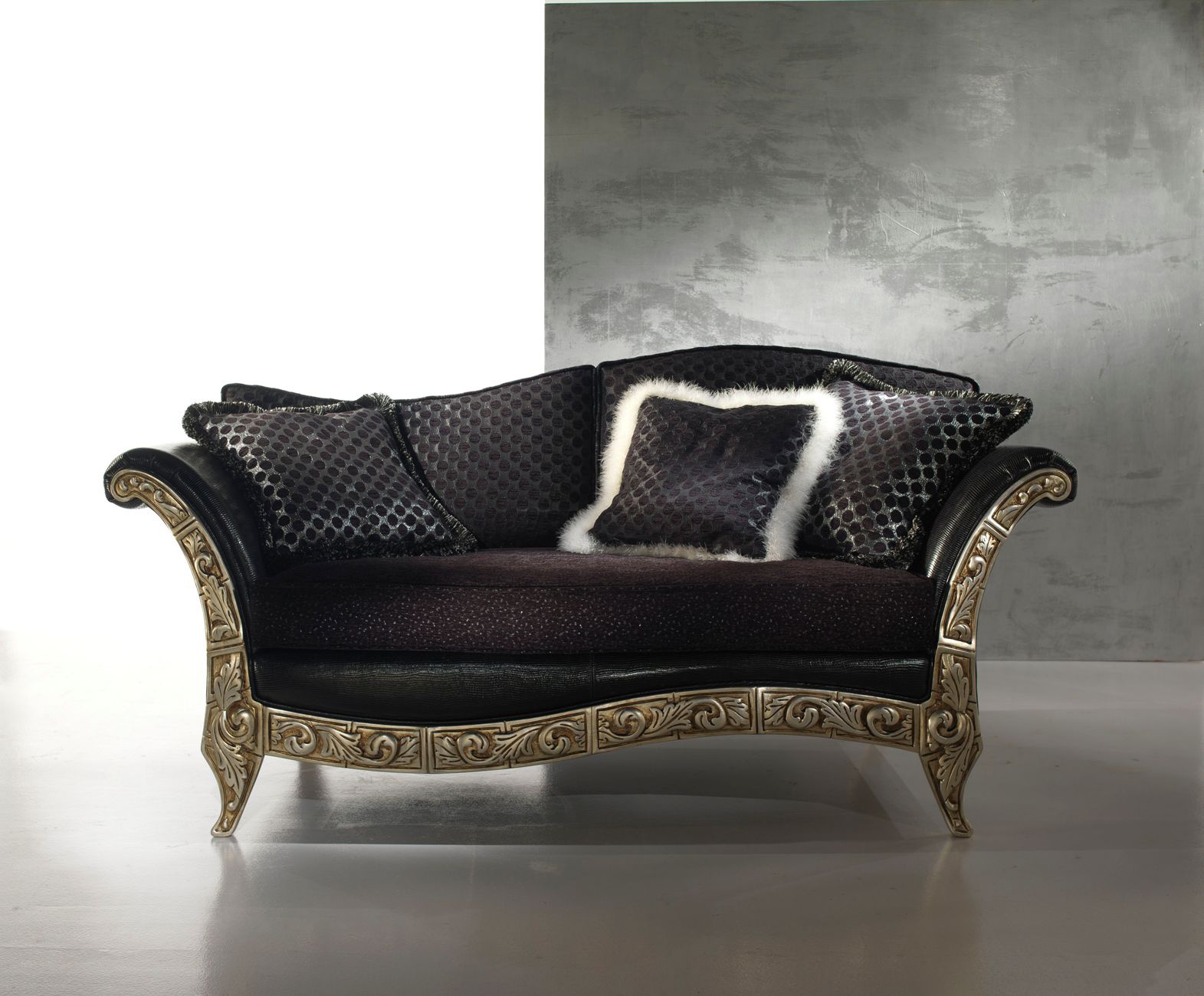 Onda sofa Silver from the Italian manufacturer Fasal Castelli. The frame is made from solid wood, upholstery - leather, and textiles from a range of campaigns. Finish options: inlay/silver plated. Double the model for the living room in a classic style. Colours in stock.
