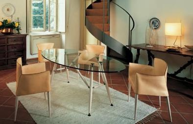 Set for the dining room from Italian manufacturer Matteograssi. Set consists of dining table and chairs. Countertop rectangular or oval shape, made of glass. The frame and legs of steel. Upholstery - leather, lining - polyamide. Set is suitable for dining room in modern style. Colours in stock.