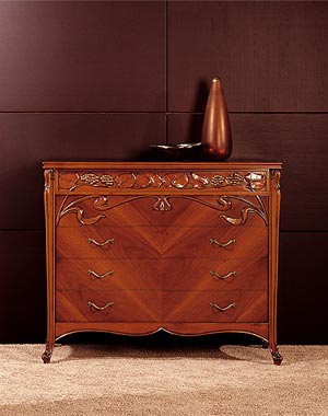 Set for bedroom in classic Liberty style from the Italian manufacturer Medea. Set consists of a double bed, bedside tables, chest of drawers and wardrobe with mirror. The furniture is made of solid wood, decorated with handmade carving. Colors: brown, natural color of the wood.