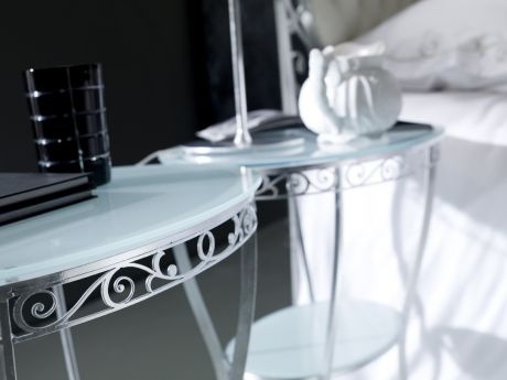 Adamo table from Italian manufacturer Bontempi Casa. Bedside table, made in a modern style. The basis of the framework laid the metal. The shelves are made of sandblasted glass.