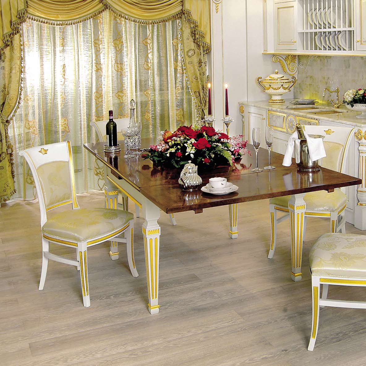 Set for the dining room from the Italian producer, Castello. Includes dining table and chairs. Material - solid wood. Finish - gloss lacquer. Chairs in upholstery textile. Colors to choose from a range of companies. The model is decorated with decorative carving handmade. Set made in a classic style.