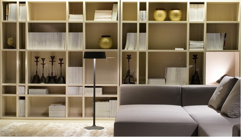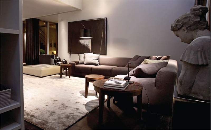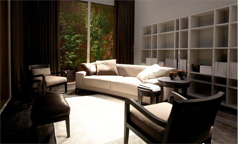 Sofa set from the Italian manufacturer Meridiani. Set consists of upholstered furniture (sectional sofa/double sofa/triple sofa and chairs) and shelving. Frame of furniture is made from solid wood, upholstery - leather or textiles from a range of campaigns. Colours in stock.