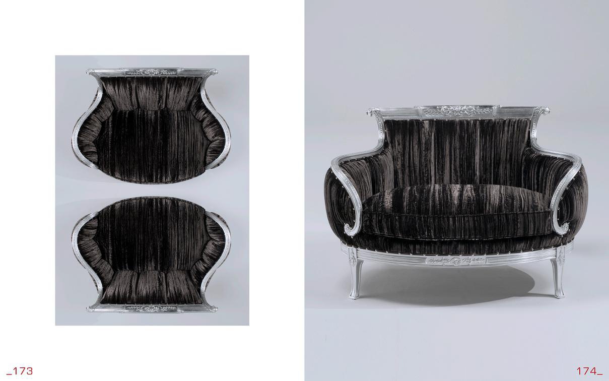 Sofa set from the Italian manufacturer Cappellini Cornelio. Includes sofa and chair. Material - solid wood painted in silver color. Back and seat with a semicircular shape. Upholstery textile from the company portfolio. Filler - foam and feather. In addition offers decorative pillows. Set made in a classic style.