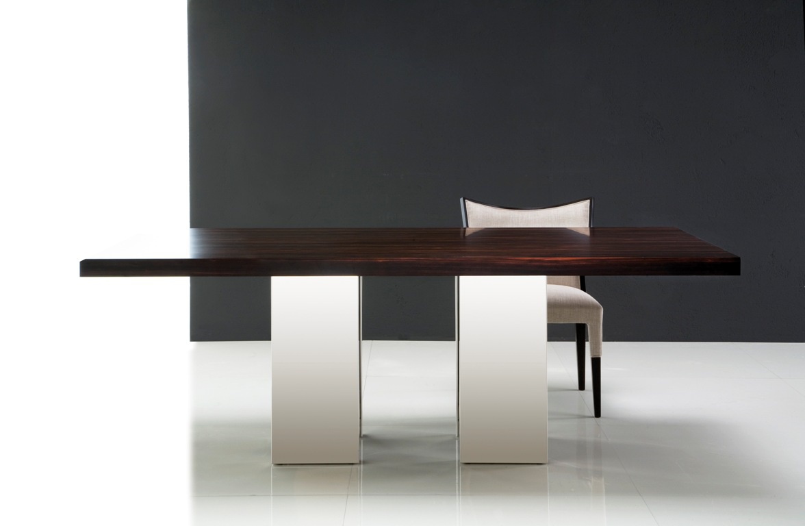 Set for the dining room from Italian manufacturer Pietro Costantini. Consists of dining table and chairs. Material - solid wood. Stainless steel legs. Table top rectangular shape in the finish color of natural wood. Chairs in leather or textile upholstery. Set is manufactured in contemporary style. Characterized by elegance, modern details and durability.