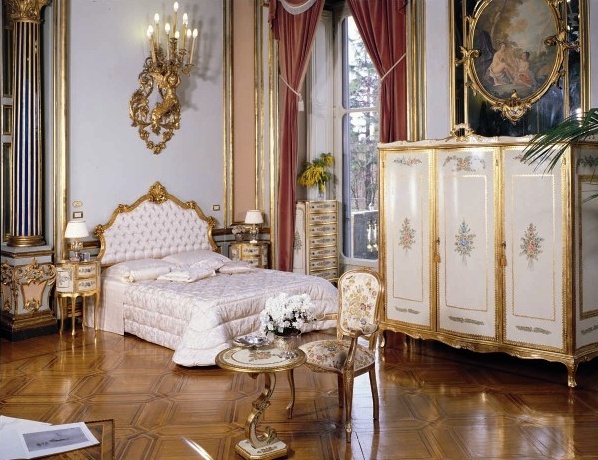 Headsets for bedrooms from Italian manufacturer Andrea Fanfani. Set includes double bed, chest of drawers, bedside tables, Desk and chair. Frames made from solid wood. Finish offered a Golden color. The head shaped form covered with a textile white. The ornament serves as a decorative stitch-Capito. Accessories made of metal. Set made in a classic style.