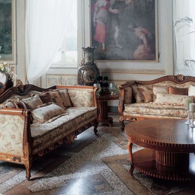 Sofa set from the Italian manufacturer Angelo Cappellini. Includes 2 armchairs, Central & side tables. Material - solid wood. Upholstery textile from the company portfolio. Filler - polyurethane foam of different firmness. The model is decorated decorative hand carved. Complement the design of decorative pillows. Set made in a classic style.