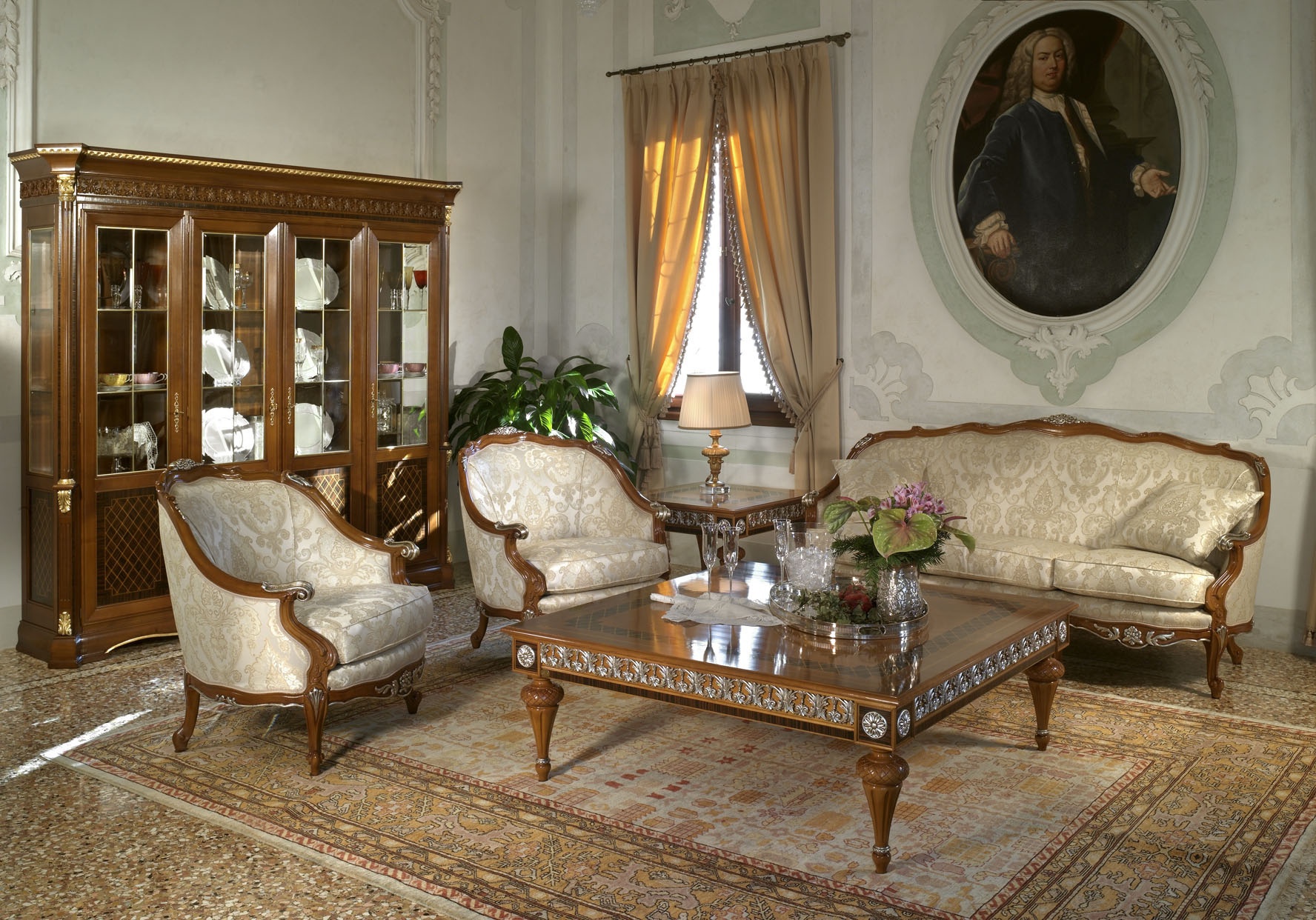Sofa set from the Italian manufacturer ARCA. Includes sofa, chairs, coffee table and showcase. Frames models made from solid wood. The finish offers a glossy varnish. The upholstery is made of textile. Colors to choose from a range of companies. Shutters and shelves made of glass. Set made in a classic style.