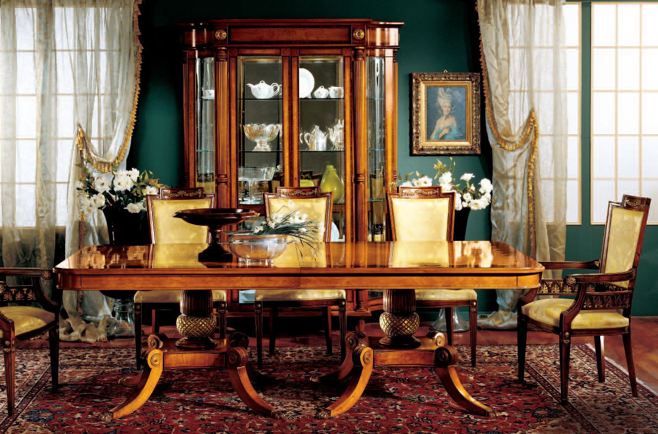 Set for the dining room from Italian producer Armando Rho. Includes dining table, chairs and cupboard. Material - solid wood. Finish - gloss lacquer. Chairs with or without armrests. Upholstery textile from the company portfolio. Shutters and shelves made of glass. Swing doors are locked. Set made in a classic style.