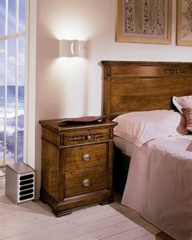 Italian furniture for bedroom production Moletta Mobili, a collection of Callas. Set includes: double bed, chest of drawers and bedside Cabinet. The frames are made of solid walnut in the classical style, decorated with carved decoration. Colors: natural wood color. Set of different severity of geometric shapes and soft rounded elements.