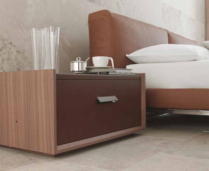 Italian furniture for bedroom production of Alivar. Set includes: double bed with soft headboard, bedside Cabinet and drawers. Bed frame - steel chrome legs. The back and side parts made of wood. Soft headboard upholstered in leather with penopoliuretanom filler. Drawers with wooden handles and a leather upholstered top. Set is manufactured in contemporary style.
