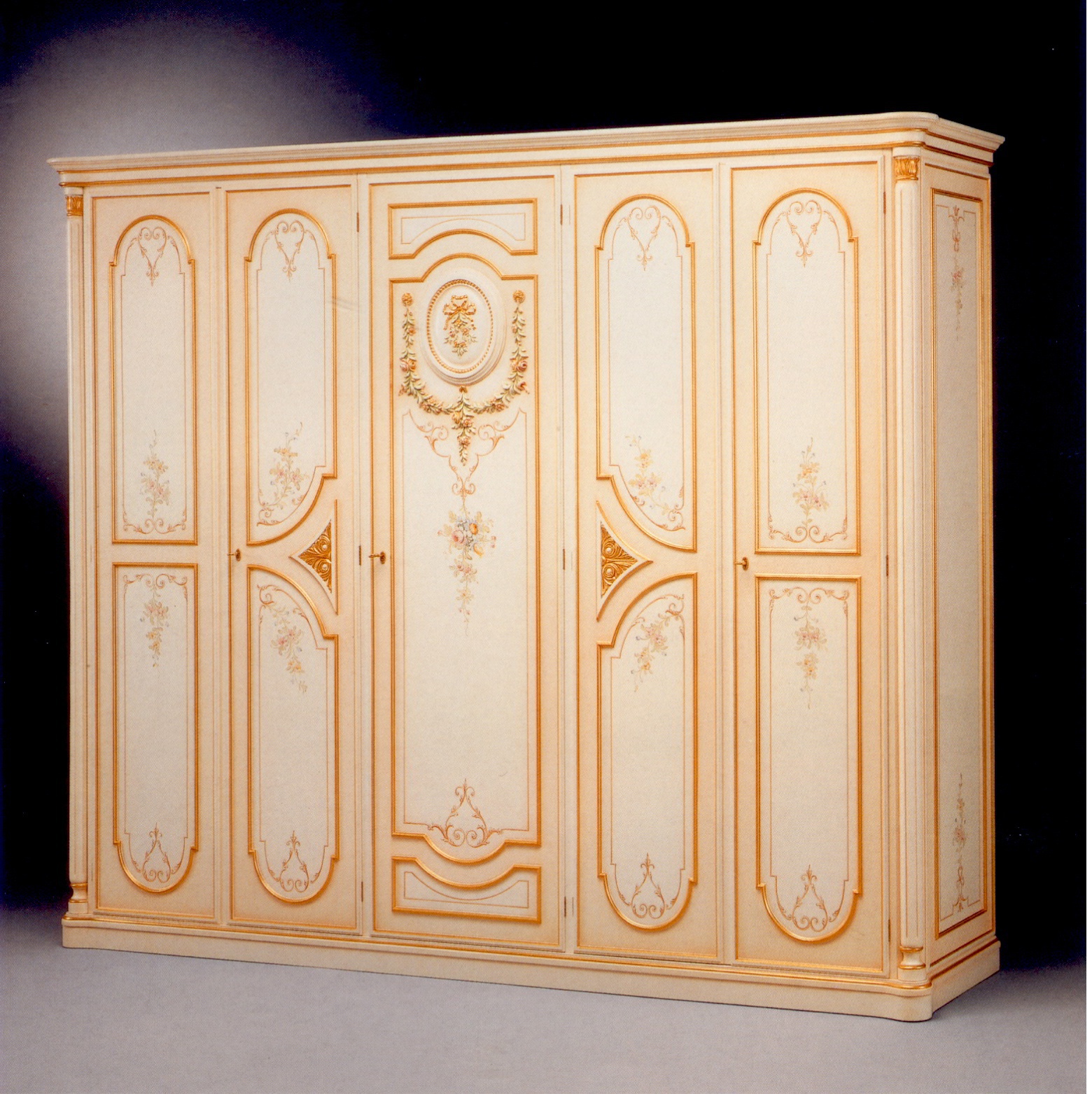Headsets for bedrooms from Italian manufacturer Meroni Francesco. Includes double bed, bedside tables and wardrobe. Frames models made of solid wood. Finish to be selected from the range of the company. The head shaped form covered with a textile. The metal fittings. Swing doors are locked. The model is decorated with carved elements and gold-plated. Set made in a classic style.