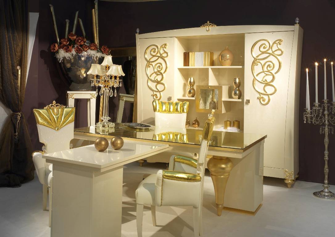 Headsets for the office from the Italian manufacturer Lanpas. Consists of Desk, armchairs and wardrobe. Frames models made from solid wood. The finish offers a glossy varnish. Chairs with high backs and armrests. The upholstery is leather. Color finishes available in combinations of white and gold. Headsets are made in a mixed style.