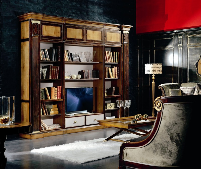 Bookshelf from Italian manufacturer Decora. The model is made in classic style. Frame and shelves made of solid wood. The edge is decorated in the form of columns. Sash blind and open. Accessories metal painted in Golden color. There is a place for TV. The model is distinguished by elegance, strength and capacity.