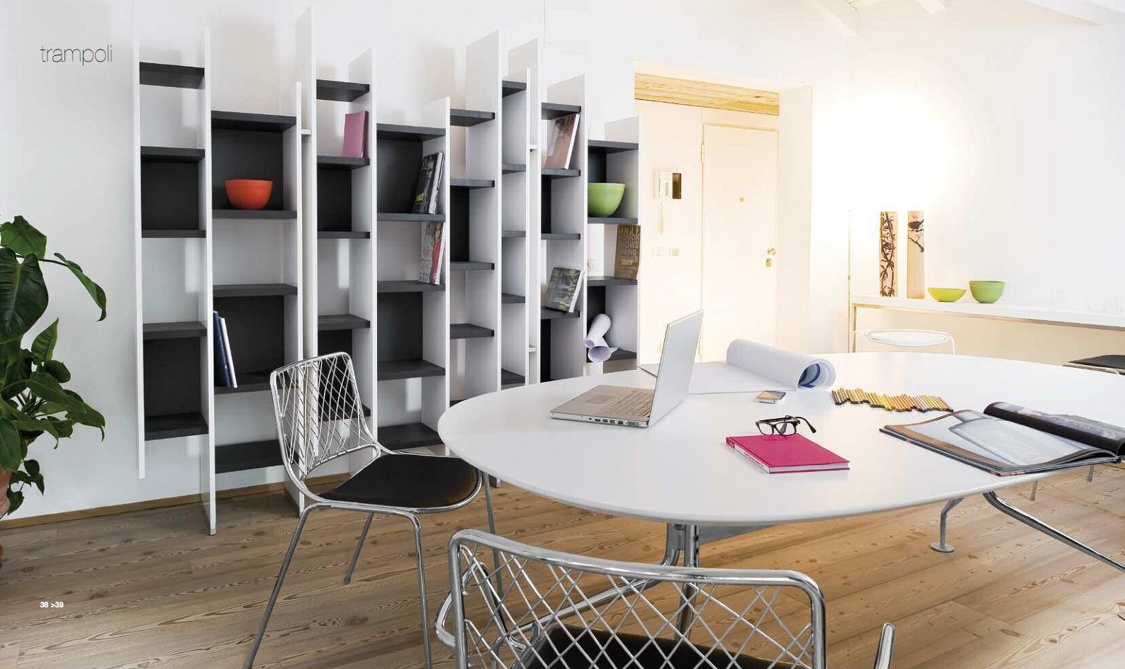 Rack Trampoli, from the Italian manufacturer Accademia. The frame is made of wood. Finishing varnish from the company portfolio. Colors: white and black. Shelves are made in different height and different width and length. The rack is distinguished by its functionality.