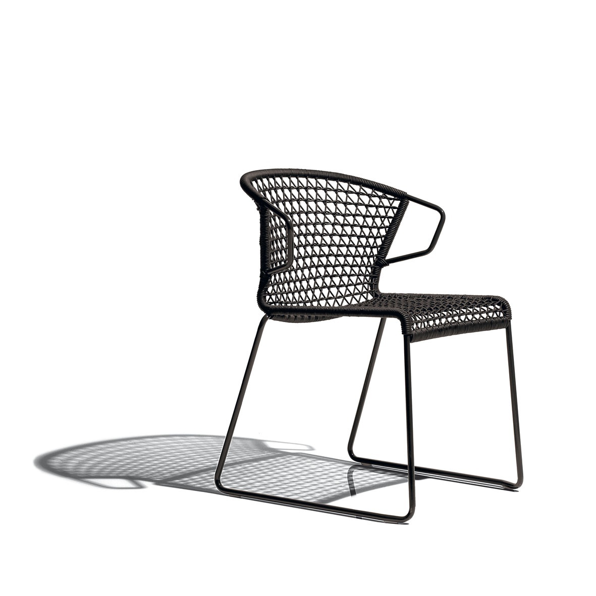 Vela armchair, from the Italian manufacturer Accademia. the frame is made from chromed metal. Seat and back made in the form of weaving. Finishing varnish from the company portfolio. The model is also suitable for outdoor use. The chair is supplemented with armrests.
