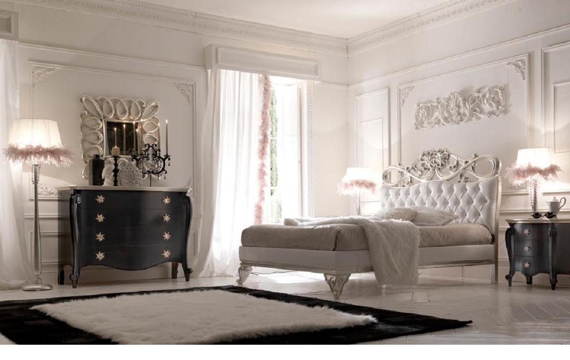 Italian furniture for bedroom production Avenanti. Set includes: double bed, bedside tables, a chest of drawers. Upholstered headboard adorned with decorative carved flowers. Legs - carved. The handles of the drawers are made in the shape of flowers. Colors: white and black. Set is made in a classic style.