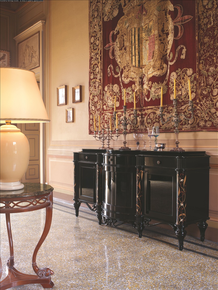 Canteen, from Italian manufacturer BelCor. The frame is made of wood. Finishing varnish from the company portfolio. The model is decorated with carved decoration and pattern. The sideboard will perfectly complement the classic interior of dining room.