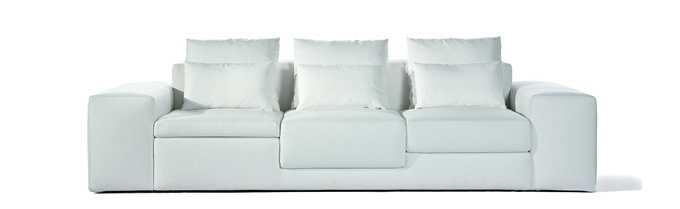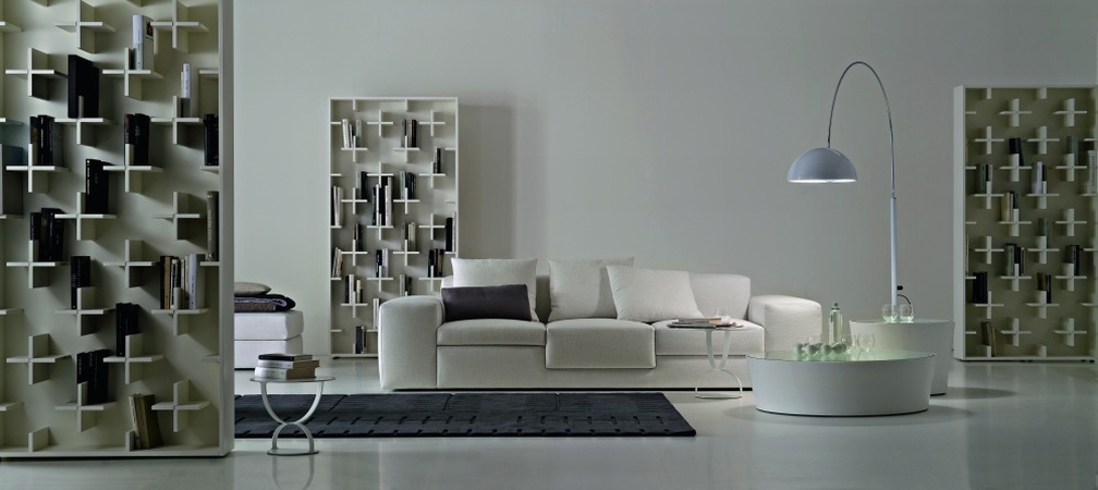 Sofa set from the Italian manufacturer Arketipo. Set includes: modular or three-seat sofa, bookcase and coffee tables. Frame of furniture is made from solid wood, legs are made of plastic. The upholstery is presented in a leather and textile version. Colours in stock.