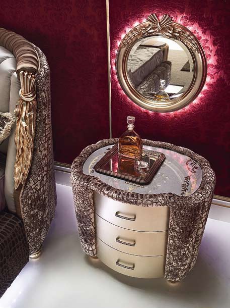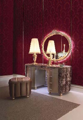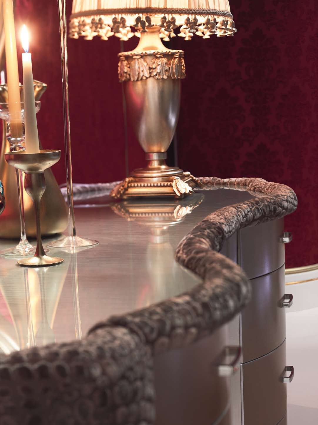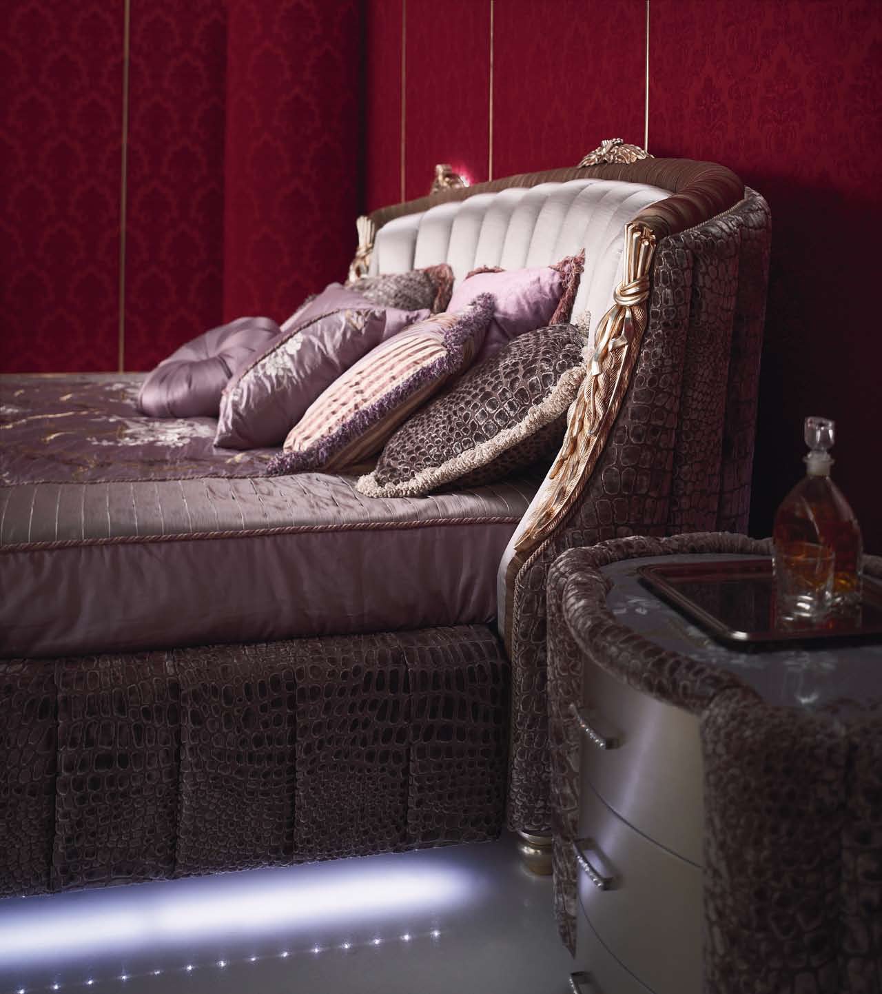 Set for bedroom Italian manufacturer Paolo Luchetta. This headset model presented beds, benches, cabinets, dressing table and stools. Double bed with high upholstered headboard. Table with drawers. Color in bronze tone with purple accents.