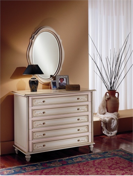 Italian bedroom set manufacturer Pellegatta. This headset presents single bed, bedside table, wardrobe and chest of drawers. Bed with high headboard. Corner wardrobe fitted with drawers and hinged lockers. The bedside table on legs with four drawers. Dresser with round legs. A style classic.